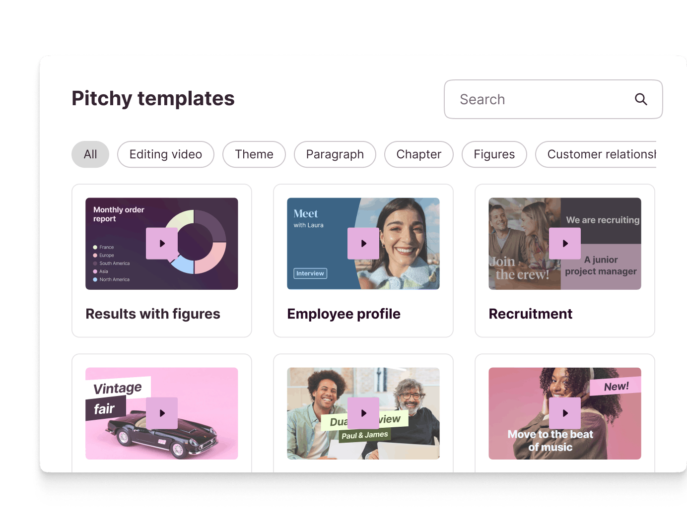 Pitchy allows you to centralise all your videos on a single platform. It's easy to go back to the last video or find and edit any video created by other members of your team.